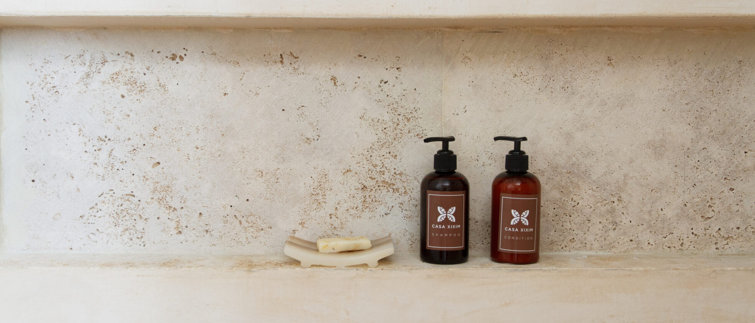 Due to our off-grid sustainable waste water wetlands system (no septic tank) we provide eco-friendly bath products. Suds up with our all natural honey shampoo, conditioner and soaps made by Yucatan Senses. To eliminate plastic waste we refill our vessels for each guest.